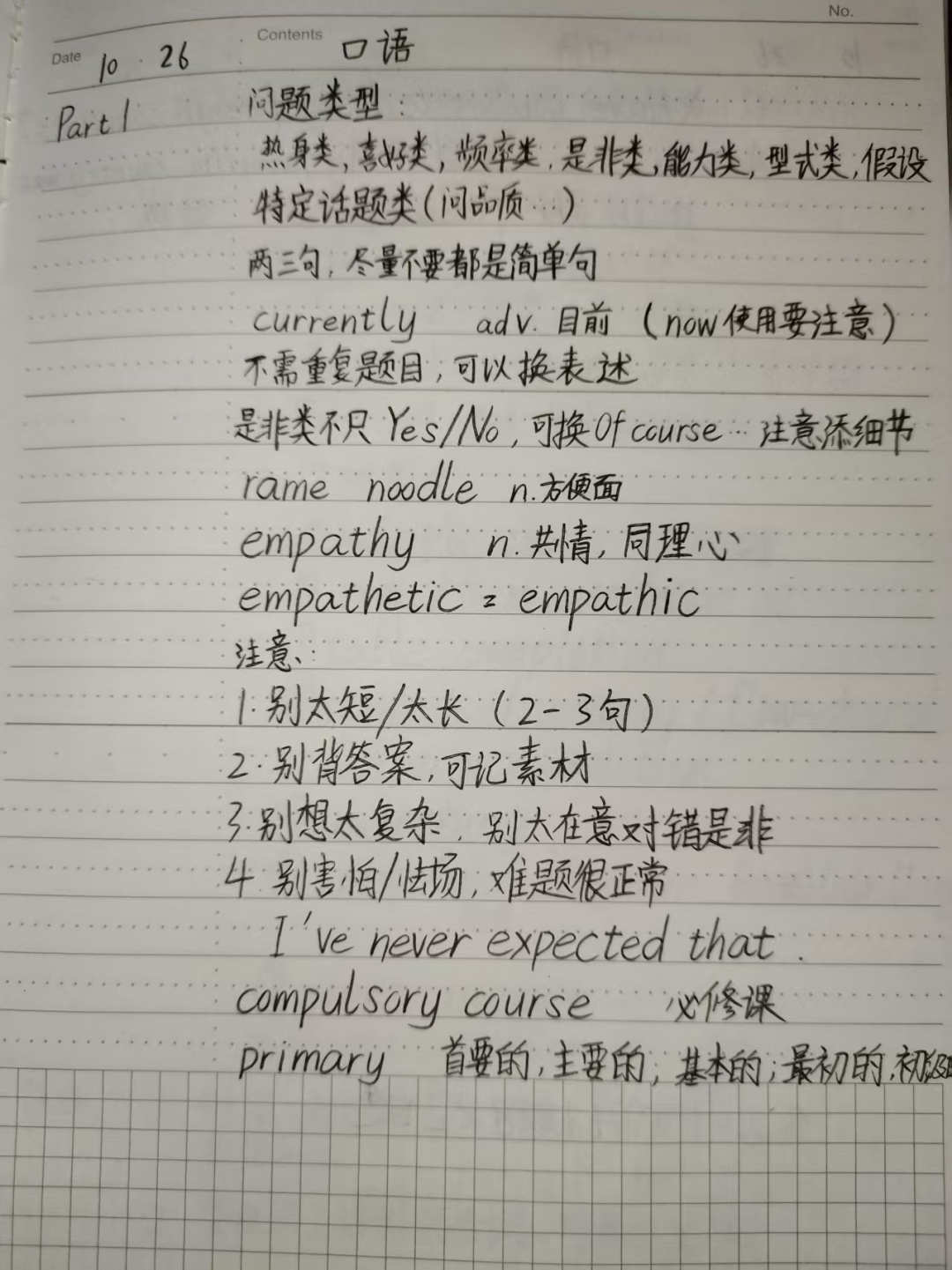口语的话,我感觉自身不甚擅长,只能说多开口练吧。口语重在平时积累,如果妄想临时抱佛脚只会像我一样考前背了五六页素材而面对考官时只能想起两句话😂。