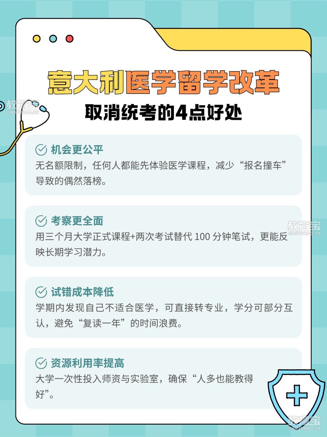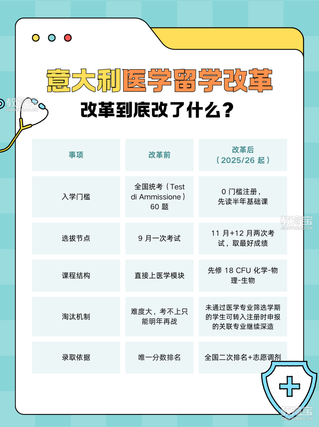 意大利大学与研究部 2025/26 学年新规:意语授课「医学与外科」「牙科」「兽医学」直接取消传统入学考试;9 月 1 日起所有人先进“开放学期”,读化学、物理、生物三门基础课,共 18 学分;11 月 20 日 / 12 月 10 日两次进行全国统一考试,三门均 ≥18/30 进入全国排名就有机会正式入读医学院。